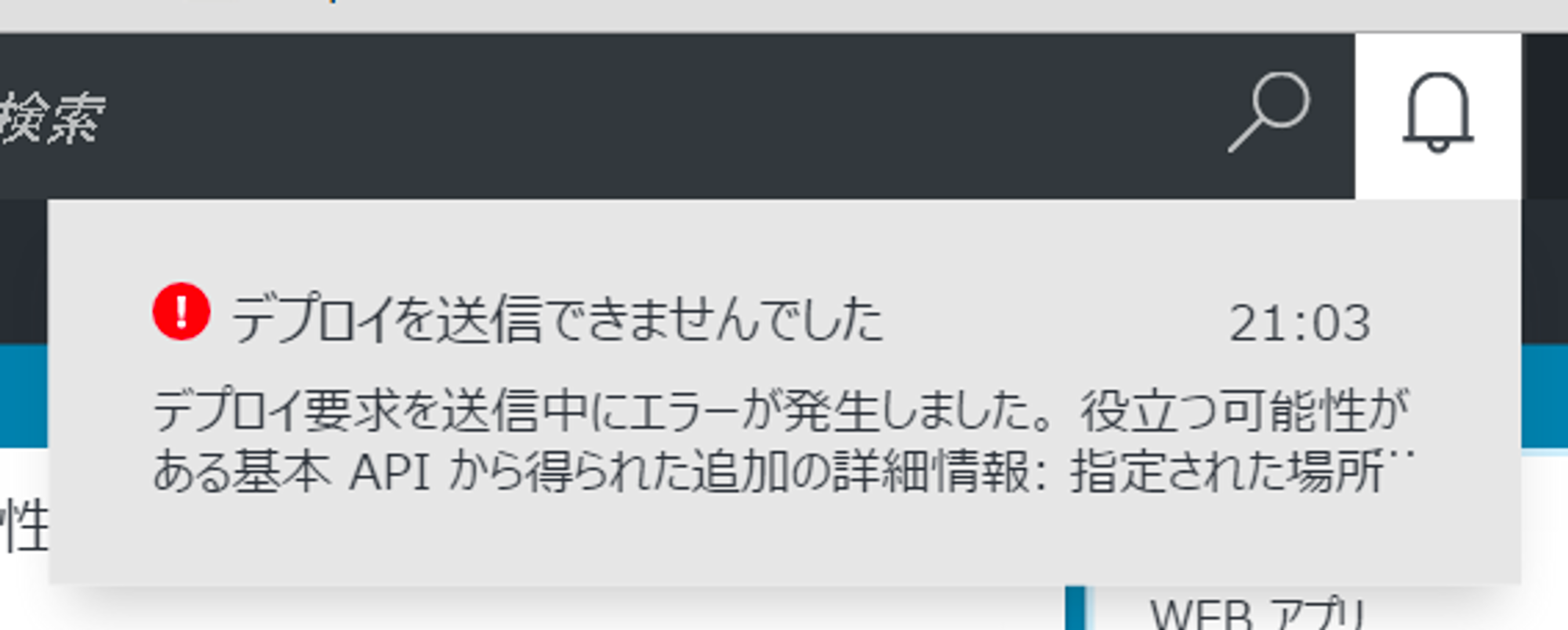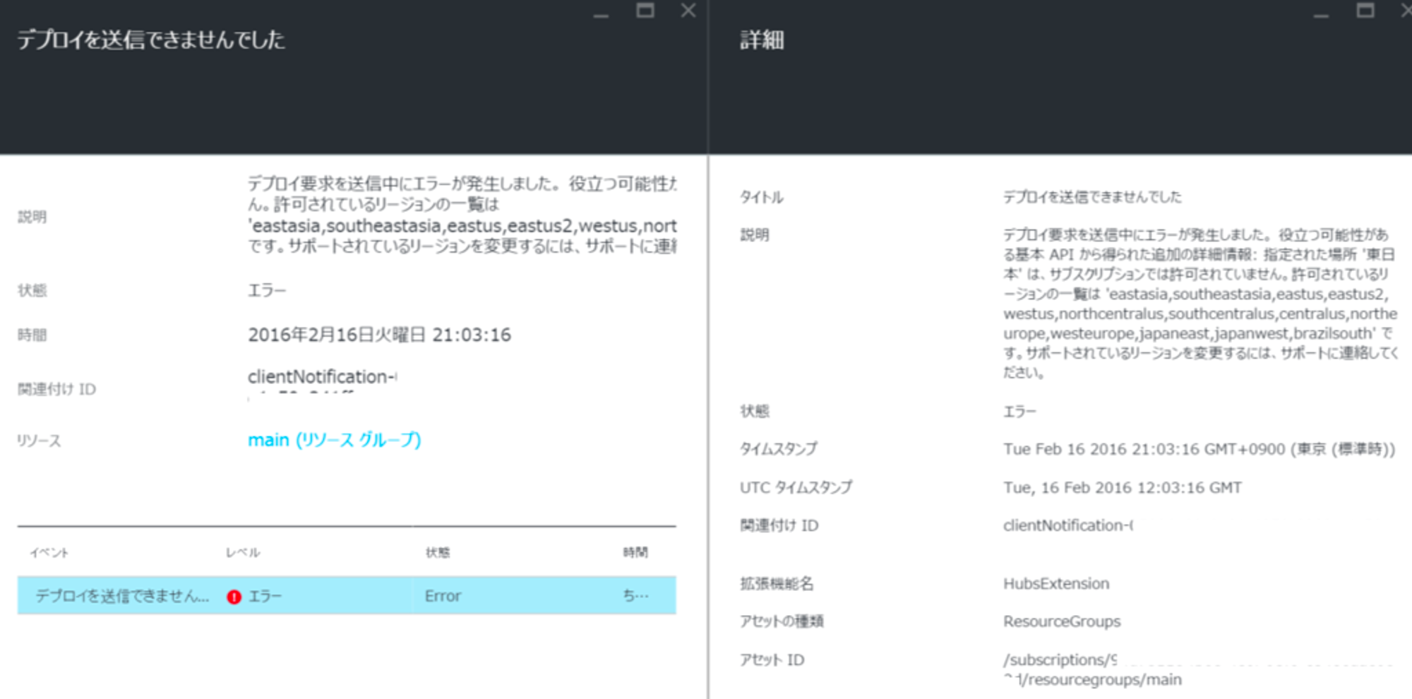 デプロイ要求を送信中にエラーが発生しました。 役立つ可能性がある基本 API から得られた追加の詳細情報: 指定された場所 ‘東日本’ は、サブスクリプションでは許可されていません。許可されているリージョンの一覧は ‘eastasia, southeastasia, eastus, eastus2, westus, northcentralus, southcentralus, centralus, northeurope, westeurope, japaneast, japanwest, brazilsouth’ です。サポートされているリージョンを変更するには、サポートに連絡してください。