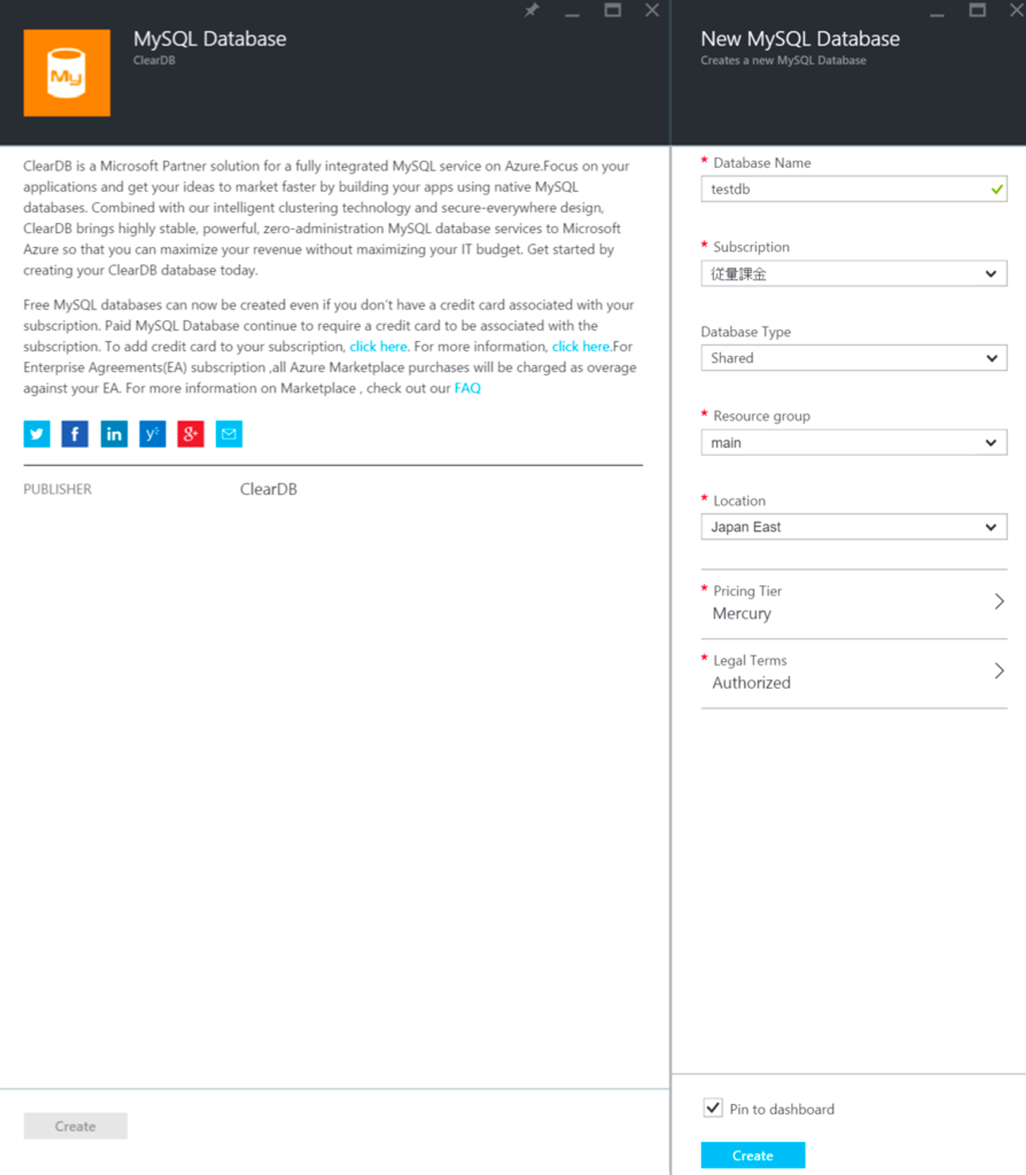 再読み込みが行われて、英語表記に切り替わって再びポータルに戻ってきましたので、再びMySQLデータベースを作成します。