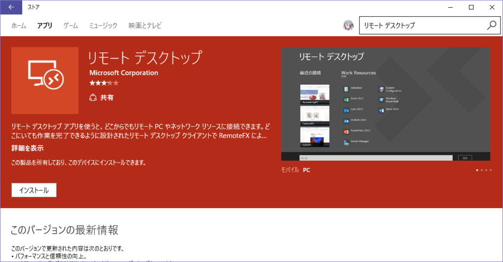 Windowsストアには、Microsoft純正のリモートデスクトップアプリが存在します。 このアプリを使って、Windows 10 Proデバイスに接続をしてみます。