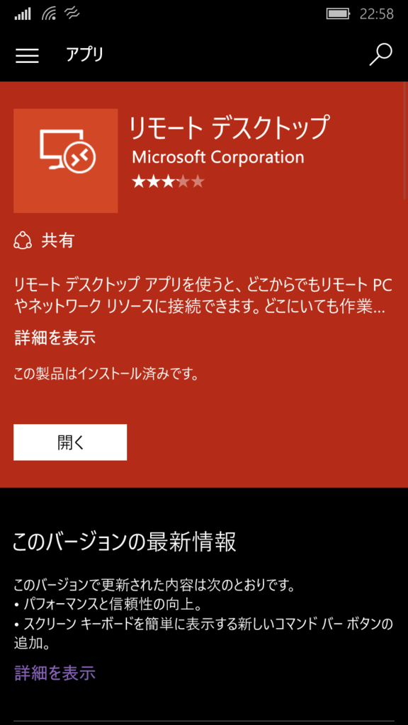 Windwos 10 Mobile端末から、ストアにアクセスし、「リモート デスクトップ」と検索すれば出てきます。 「リモート」と「デスクトップ」の間に半角を入れないとヒットしません(リモートだけでヒットしますけどね)。