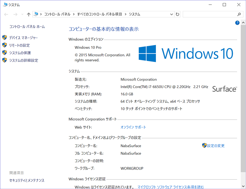 今回、接続先にはSurface Pro 4を使用しており、Windows 10 Pro端末です。 Windows 10 Homeではリモートデスクトップの接続側にはなれませんので、注意してください(以下で説明する設定項目が存在しません)。