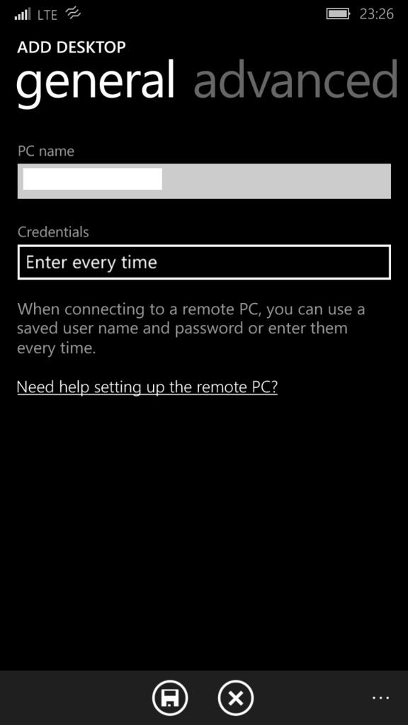 「PC name」には、先程確認したグローバスIP、もしくはDDNSドメインを入力します。 「Credentials」は資格情報です。他の設定で入力した資格情報を使うこともできます。 今回は、初めてなので、とりあえず「Enter every time」のままにして下の保存ボタンを押して保存します。