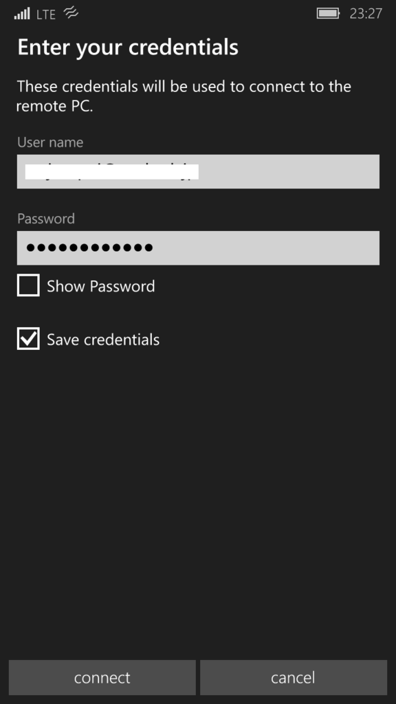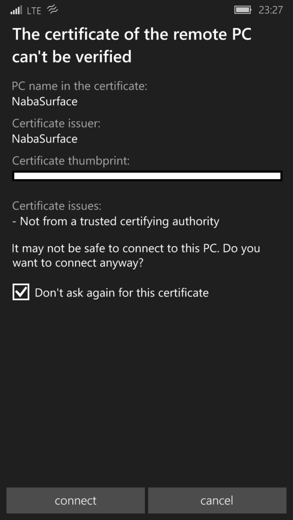 それでは、Windows 10 MobileからWindows 10 Proへリモートデスクトップで接続したいと思います。
