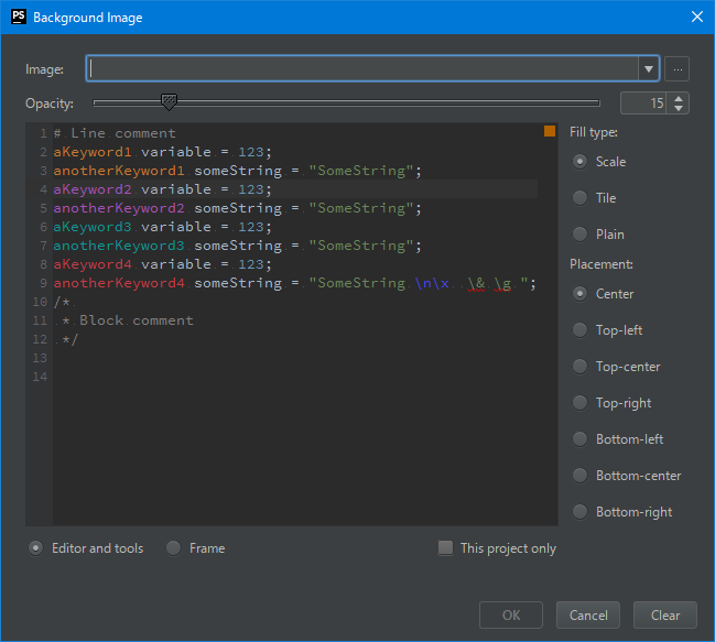 Editor and tools Editor and tools で設定をした画像は、その名の通りテキストエディタや各種ツールの背景画像になります。 テキストエディタ部にのみ画像を設定し、ツールには何も画像を設定しないという方法は出来ないようです。