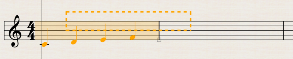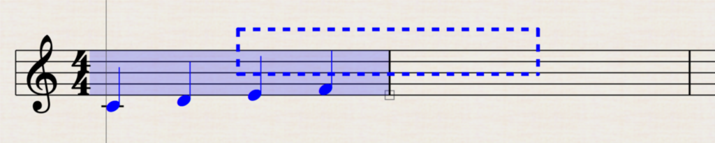 指で五線譜をタップして選択、その後ペンで書くようにドラッグをすると移動、ファンクションボタンを押しながらドラッグするとコピーになります。 青色が移動、黄色がコピーになります。