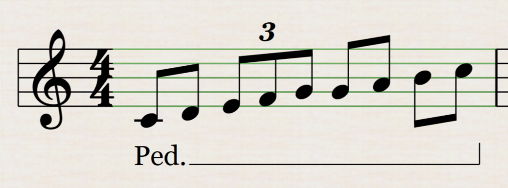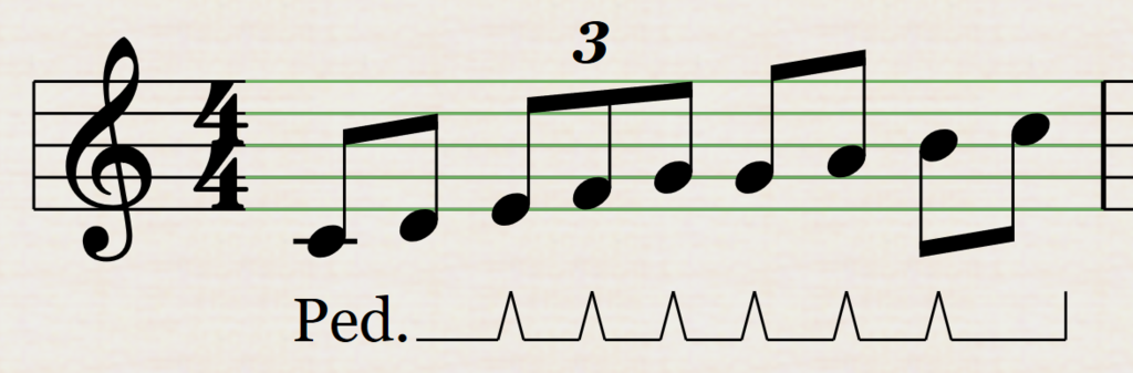 今までは踏む・離すが別の記号だったのに対し、一つの線で表されるように。 また、一つのペダルのまとまりを先に線を引き、その後ペダルの踏み変えのタイミングでペンを上にスワイプすると踏み変え記号が表示さえるようになります。