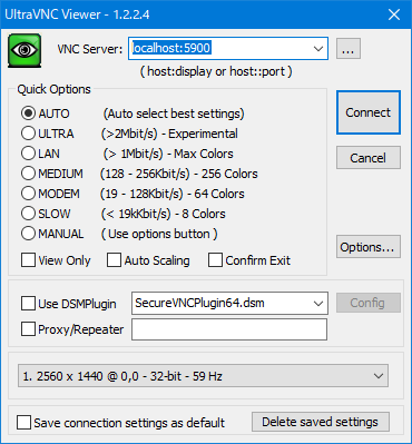 起動して、ホスト名に localhost:5900 を指定して、「Connect」を押下します。