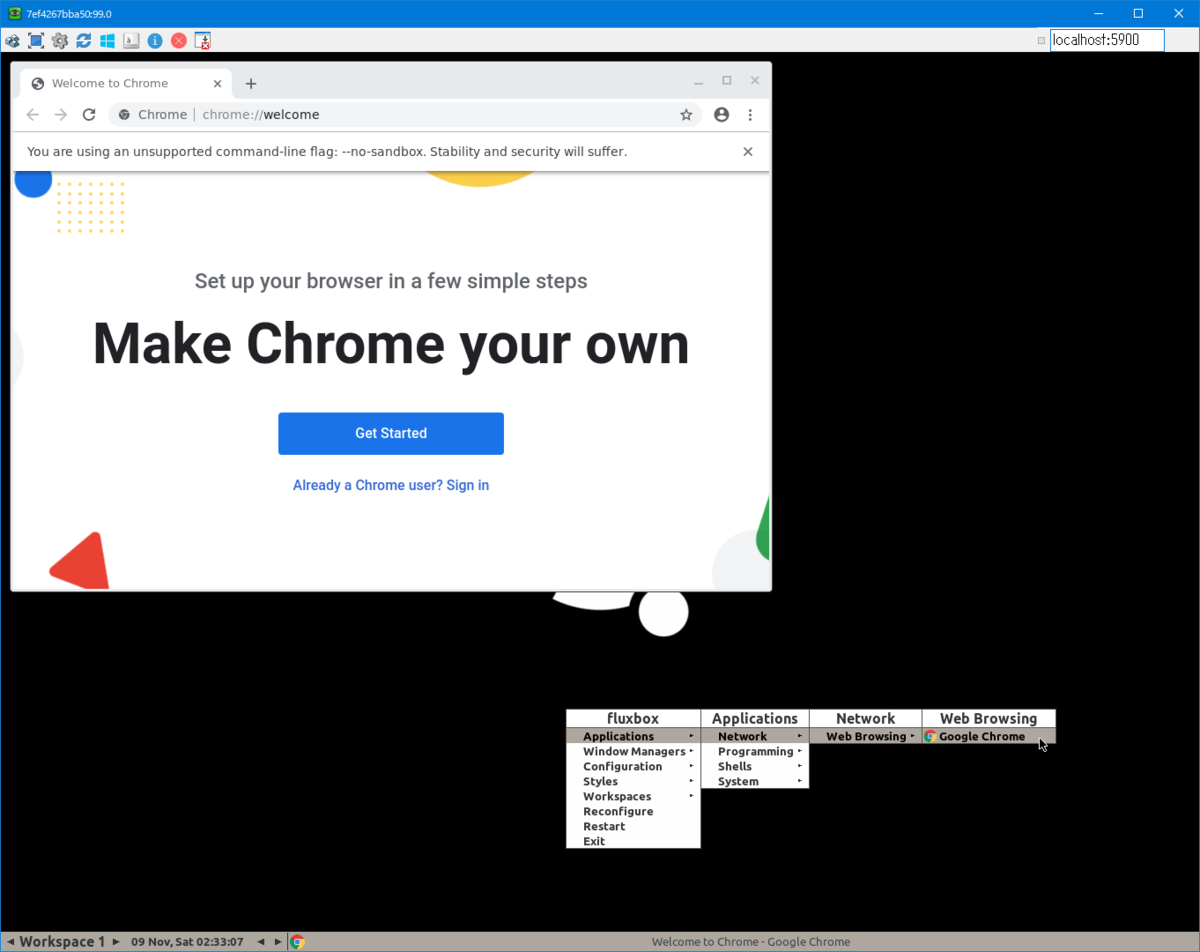 - Windows 上から UltraVNC Viewer を介してコンテナ内の Chrome の動作を確認するのに必要になります